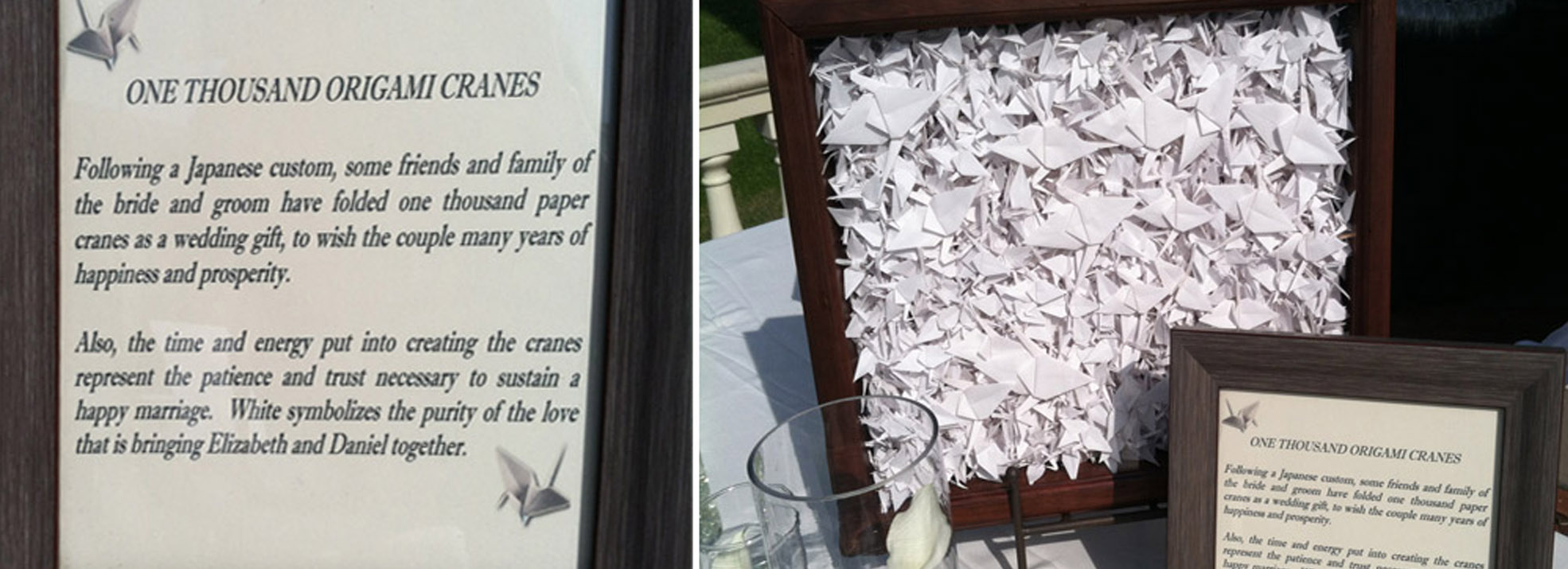 According to Japanese tradition, family and friends of the happy couple fold one thousand paper cranes as a wedding gift to wish happiness and prosperity. The bride wanted to honor this custom at her wedding without having origami birds throughout the venue. So a custom shadowbox case was fabricated to display the time honored tradition while also making a beautiful keepsake for the happy couple.