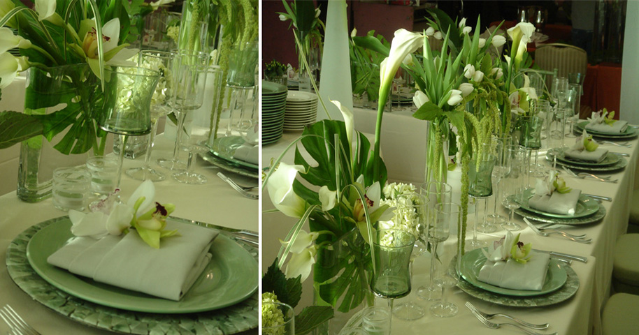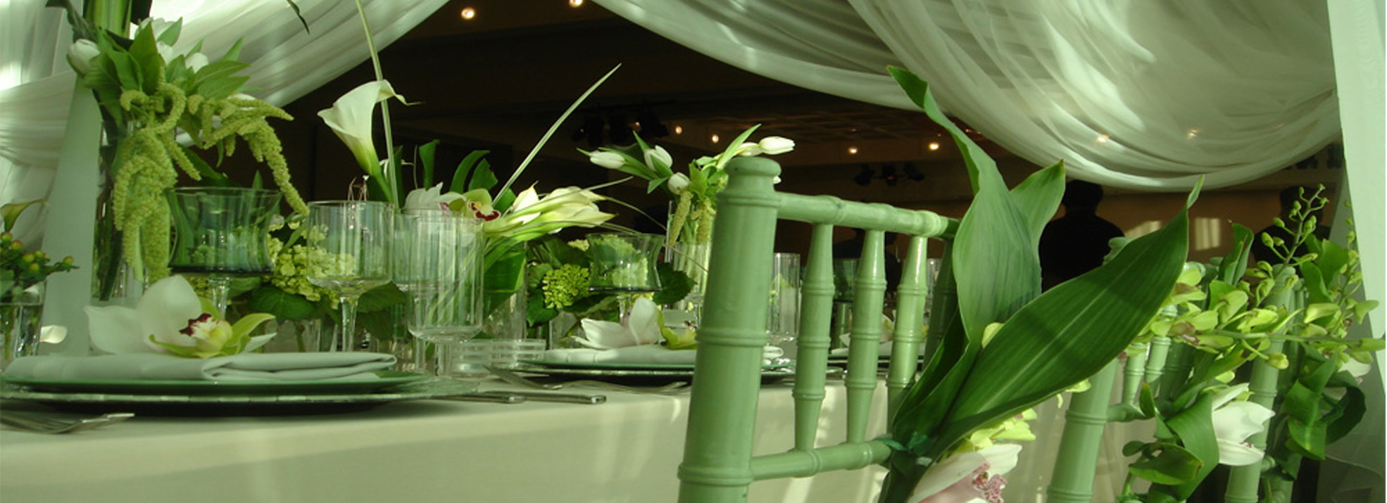 The serenity and tranquility of the Mediterranean was the desired atmosphere for this private dinner for a corporate client. Billowing sheer fabric, sage green color scheme, and elegant tropical florals were incorporated into the design of the private table décor.